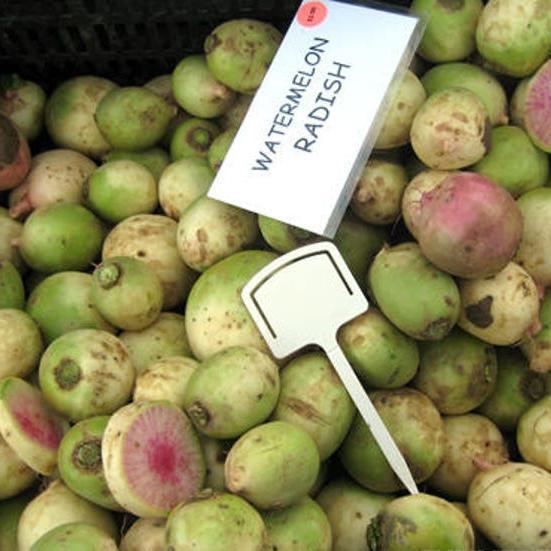 Watermelon Radishes are a 4" round Chinese heirloom variety that is both meaty & crisp. They are too cute! They look like tiny little watermelons with white & green skin, & pinky-red flesh the color of a watermelon. They look lovely sliced so they can show off all their colors, & can add a lot of fun to salads & other dishes. A lot of people have never seen this beauty before, so it is an great type to grow for market.